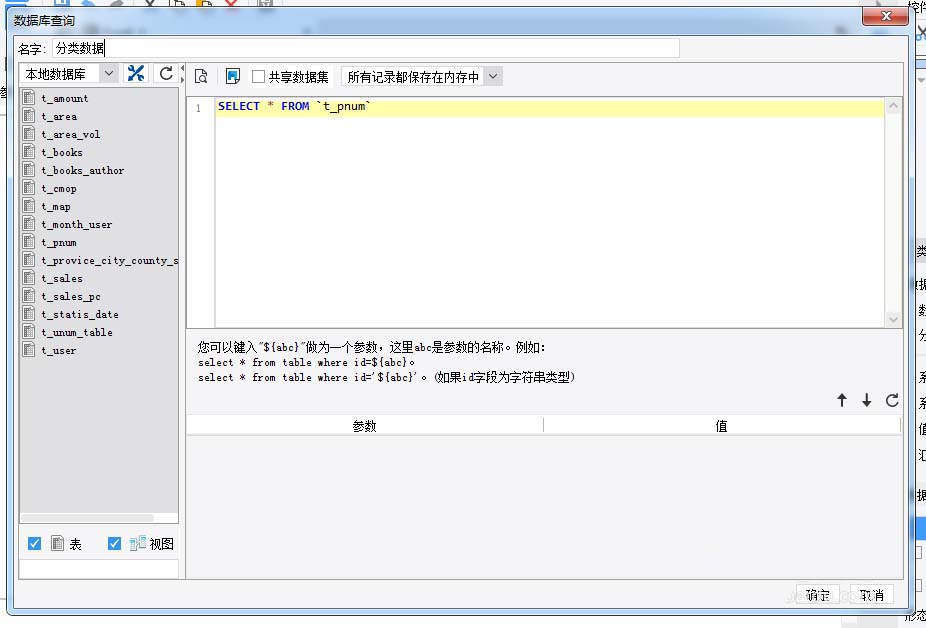 4、点击左下方的图标,新建数据库查询,使用t_pnum数据库表创建SQL查询,如下图所示: