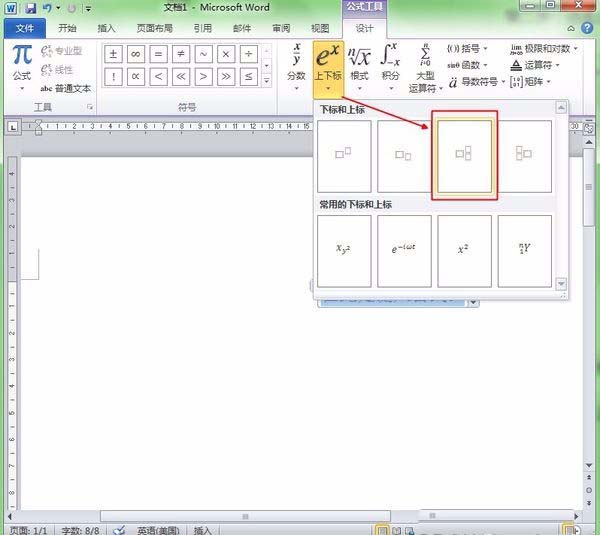 2、点击公式按钮后,会出现公式选择界面,然后在此界面中点击上下标按钮。如下图: