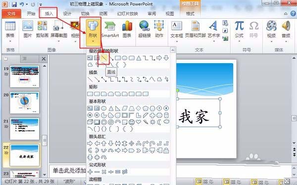 2、选择插入下的形状,并在其中选择直线,如下图: