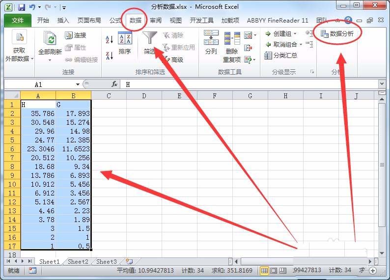 3、选中所有数据,单击数据菜单项中的,数据分析选项。