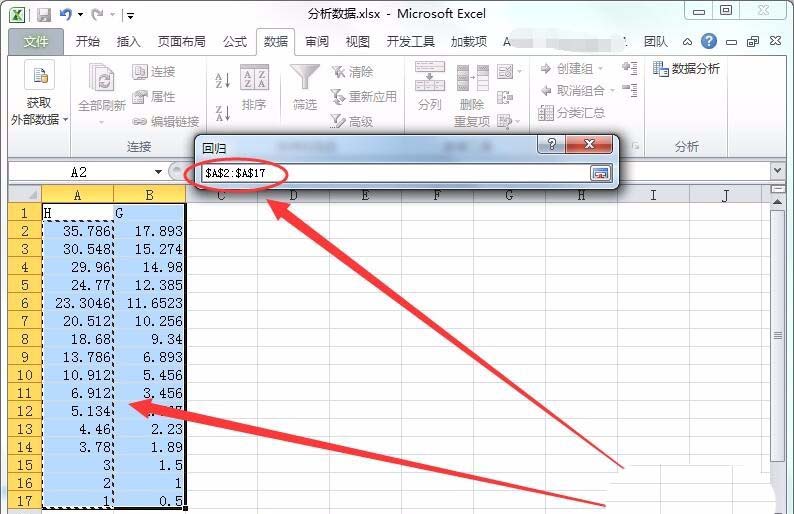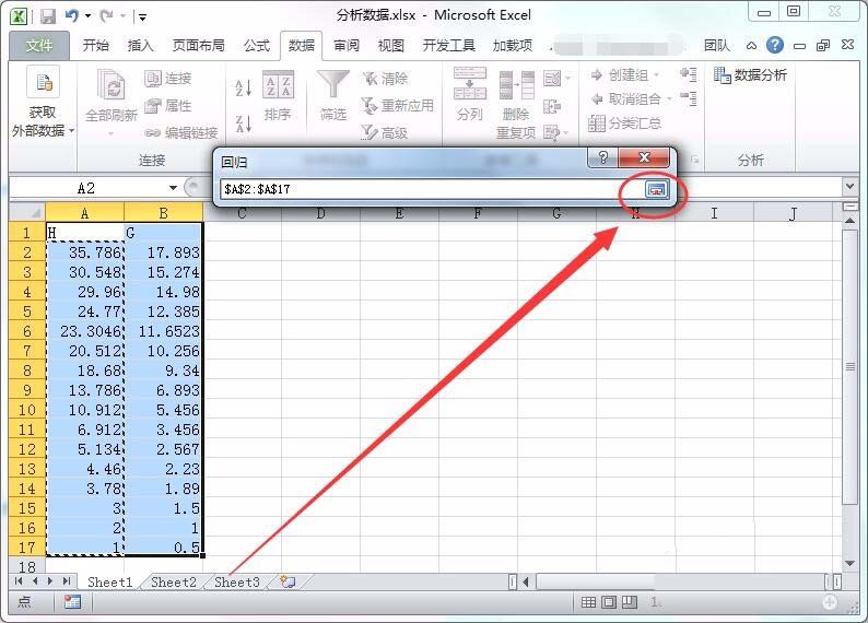 10、在出现的窗口中选择Y数据的区域,本人选择了A2:A17区域。