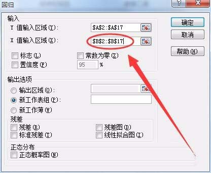 12、用选择Y值输入区的方法,选择X值的输入区,本例选择X值的区域为B2:B17。