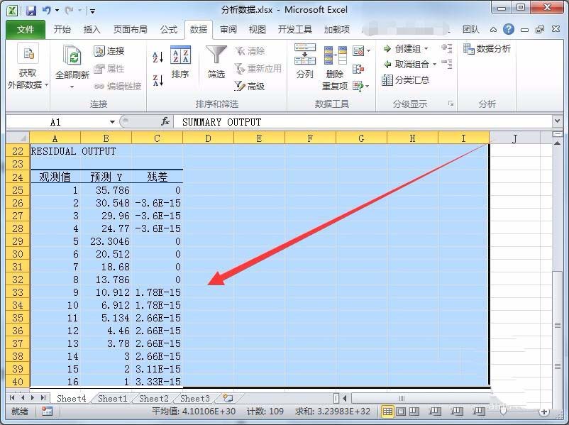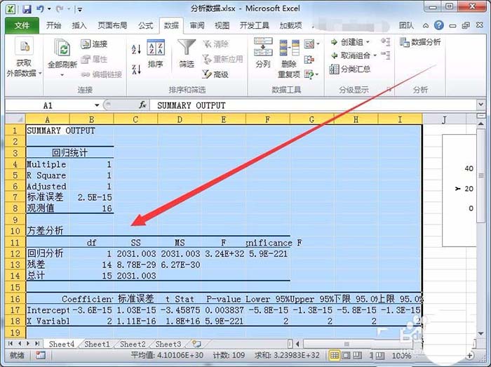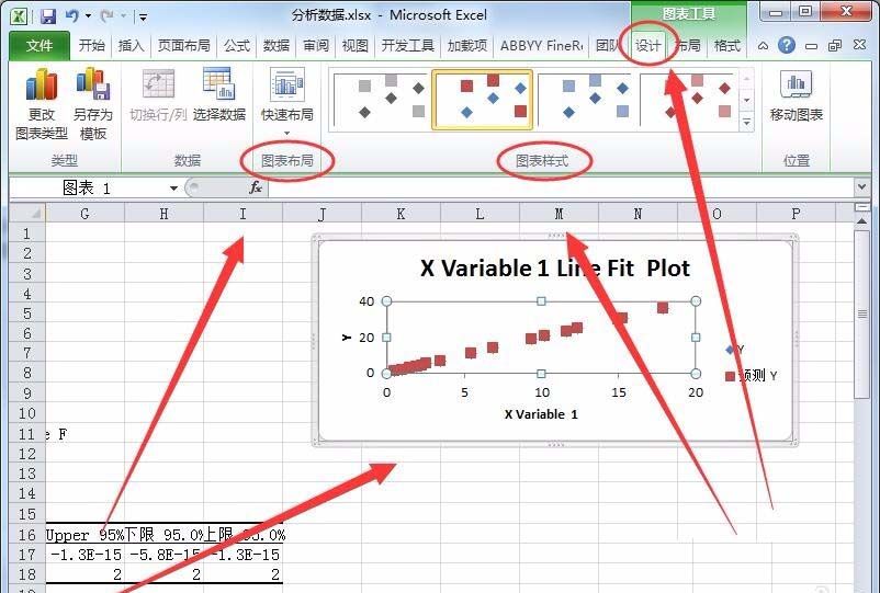 14、Excel会新建一个数据表,数据表中显示各项分析结果,例如标准误差、观测值、回归分析、残差等,还会显示观测值、预测、残差表格。