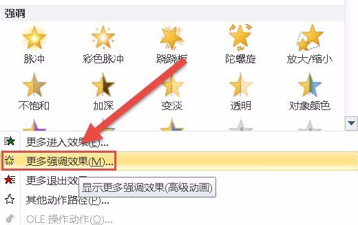 5、如果在添加动画中强调中没有找到陀螺旋,可以选择点击进入更多强调效果,操作图片如下。