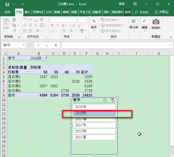 5、默认是单选,点击了“多选”按钮之后,可以同时选择多个季节下数据汇总。点击漏斗加叉号按钮,可以取消筛选,恢复默认的全选状态。