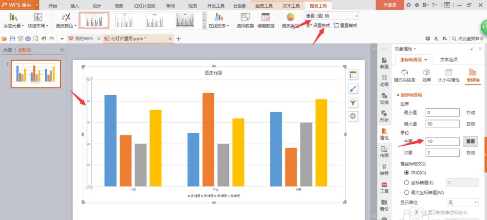 2、选择垂直轴将间距设置为10,点击‘设置格式’选择里面的‘单位’,选择需要变大的字体点击‘文本工具’进行设计。