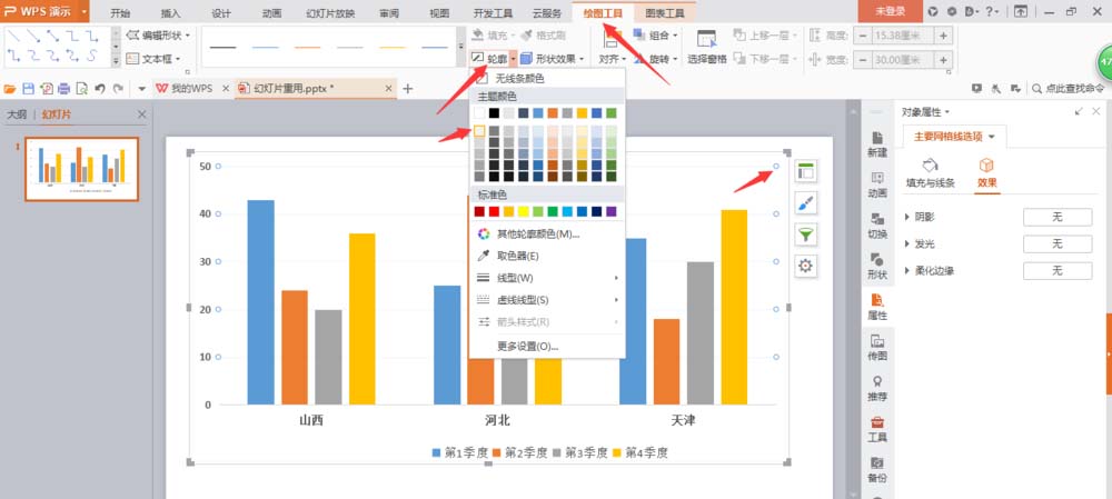 3、选择柱状图中的横线,点击‘绘图工具’--‘轮廓’选择一个淡一点的颜色。