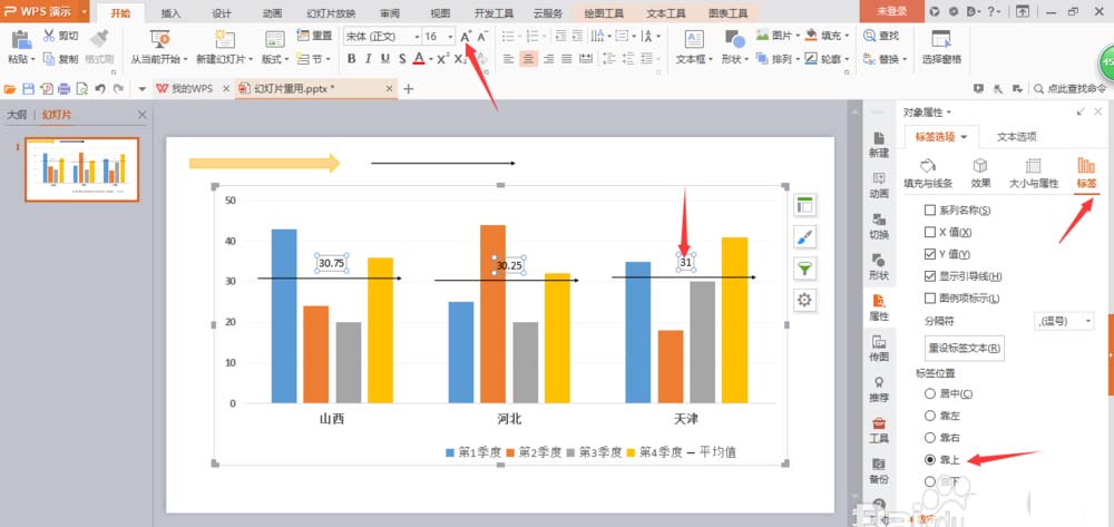 5、点击生成的平均值点,选择‘系列’--‘主坐标轴’,然后画一条箭头,使用PowerPoint工具把平均值点替换为箭头,CTRL+c和ctrl+v。