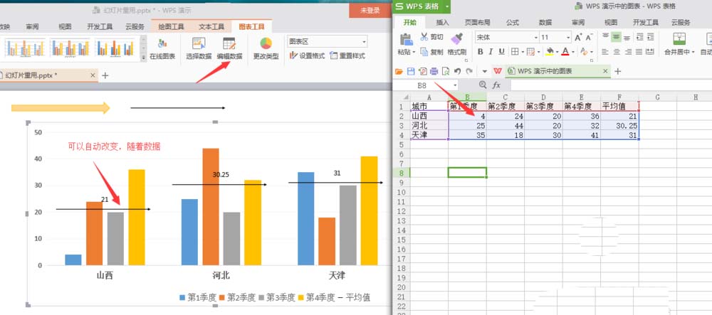 7、点击’编辑数据‘进行更改数据,可以看到平均值箭头随着数据的改变而变化。