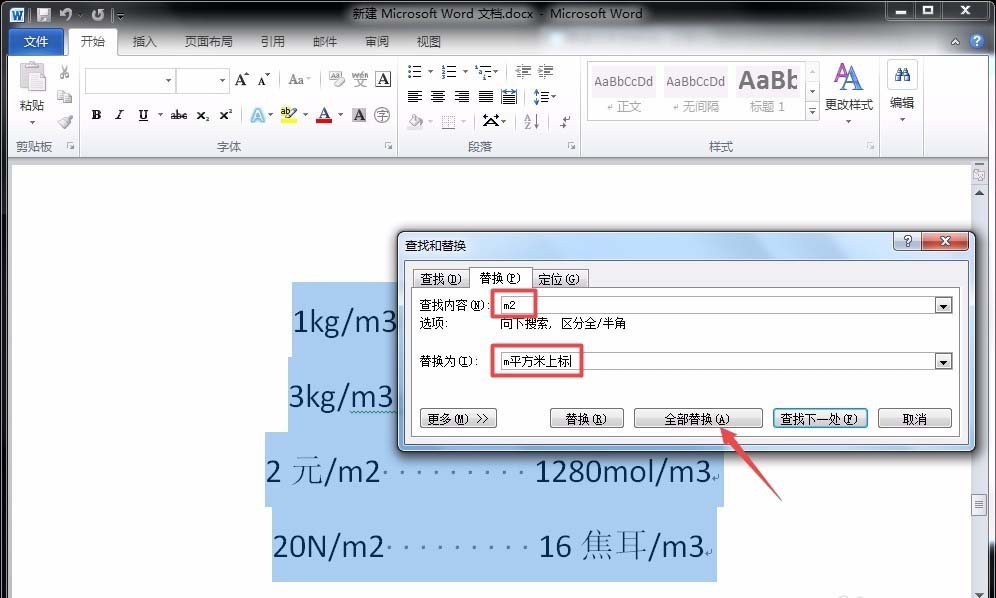 2、接着,在查找内容中输入正文中的“m2”,替换为输入“m平方米上标”,点击“全部替换”。这时,所有的“m2”都替换为了“m平方米上标”。
