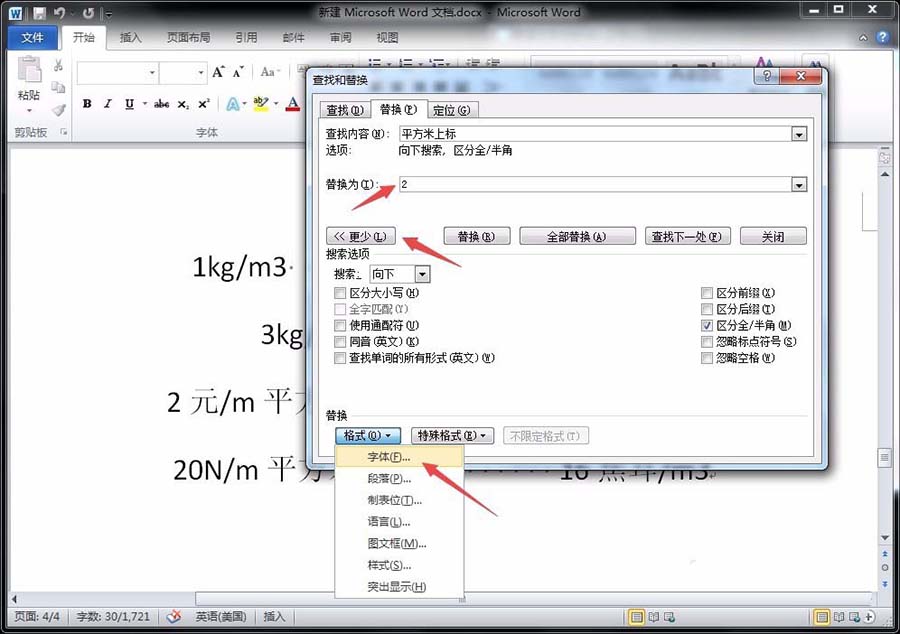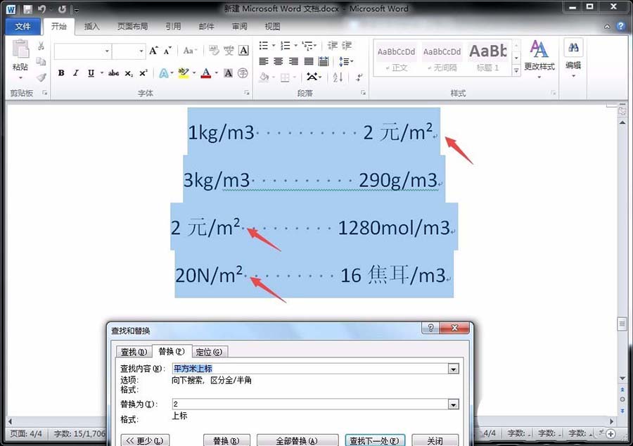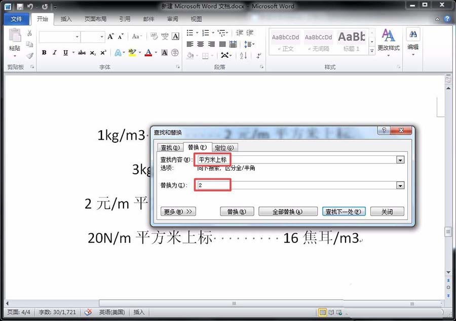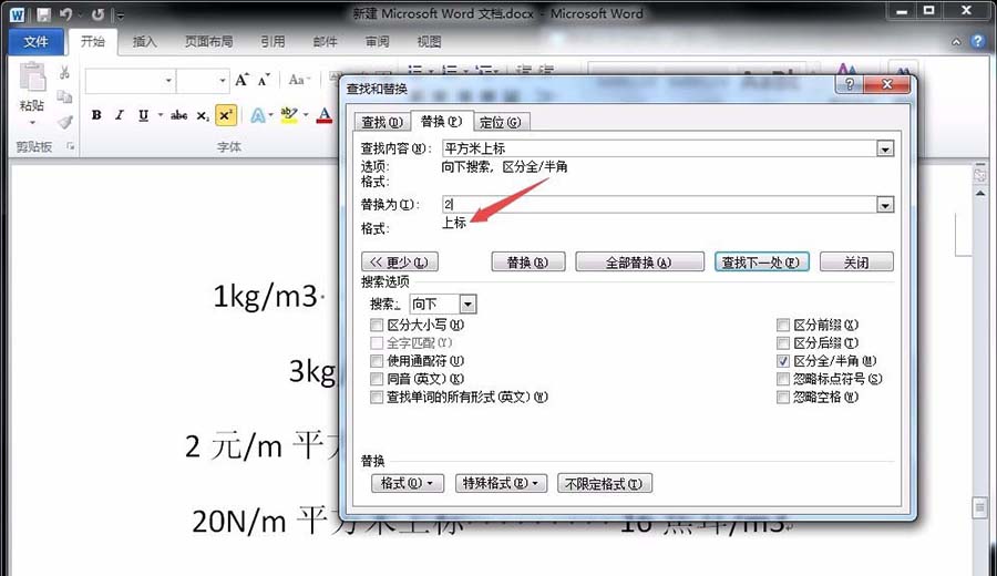 6、这时,我们就可以看到替换为这一栏下面会出现“上标”的字样,继续点击“全部替换”,即可看到所有“平方米上标”变成了“2(上标样式)”。