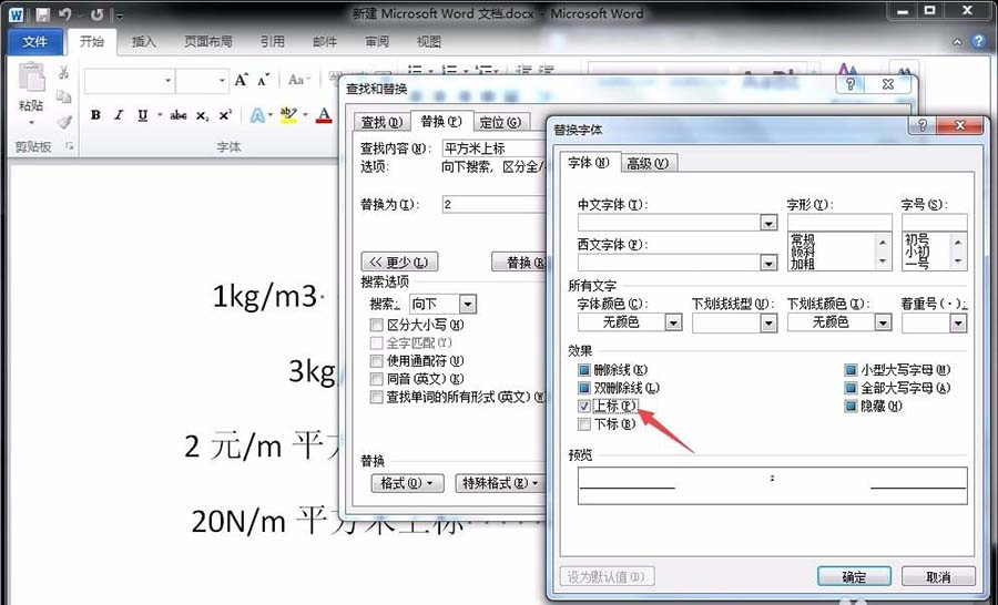 5、在替换字体对话框中,我们将“上标”勾选中,点击确定,如图所示。