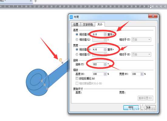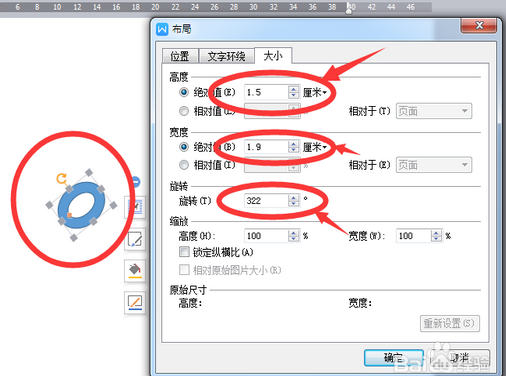 2、设置烟口的大小和角度。在图形上点击右键——其他布局选项——大小,在下面的【高度】中设置1.5,【宽度】设置1.9,【旋转】角度设置为322度。设置好后如下图。