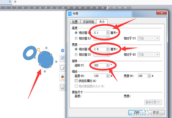 3、画烟斗部分。我们使用插入——形状中的【圆形】画出一个圆形,然后设置大小,【高度】设置为2.1,【宽度】设置为1.9,【旋转】角度设置为322度。设置好后如下图。