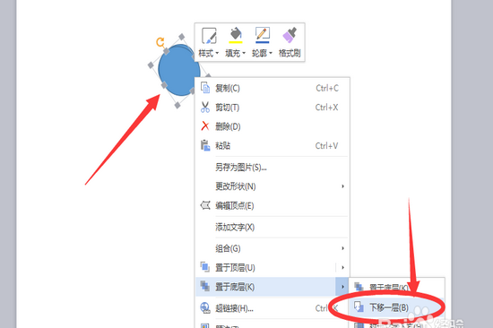 4、对烟斗部分进行微调。先将设置好的烟斗放置到如下图的位置,这时我们看到,烟斗出现在了烟口的上方,这时我们需要在烟斗上点击鼠标右键,在弹出的快捷菜单中,选择【置于底层】——【下移一层】将烟斗调整到烟口的图层下方,如下图。