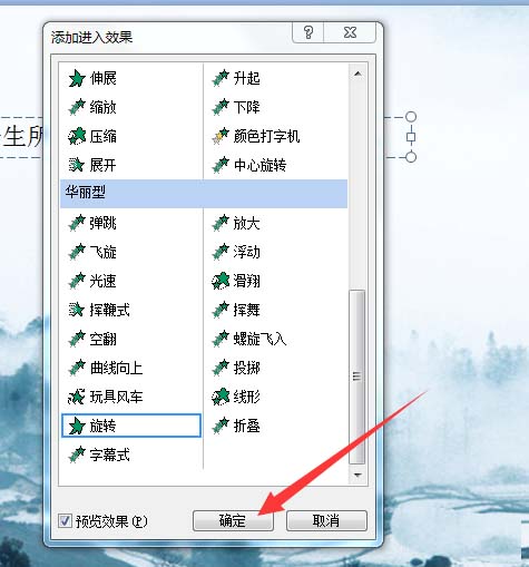 6、下拉页面找到华丽型里面的旋转,选中并点击确定。