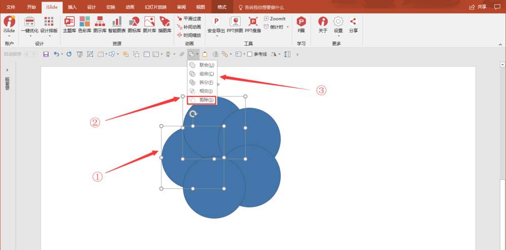 3、先选中①再选择②,然后点击布尔运算中的【剪除】