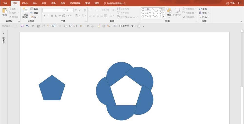 6、再插入一个五边形,摆在中央,设置填充色为白色