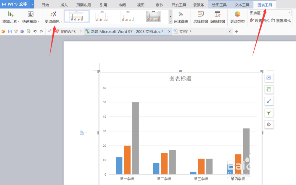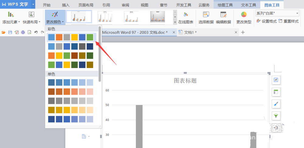 3、如图所示,菜单栏内出现菜单“图表工具”菜单--"更改颜色“。