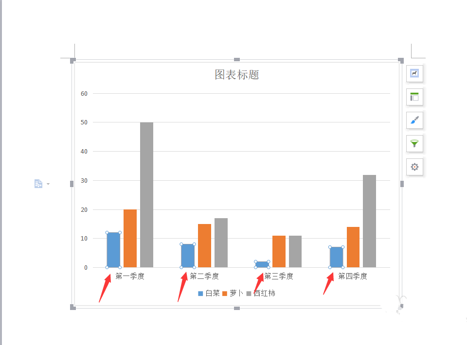 1、如图所示,我们采用了三种颜色代表三种蔬菜的销售情况,我们如何改变现有的三种颜色呢?