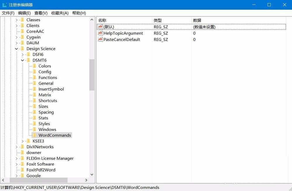 4、找到到下面的路径:HKEY_CURRENT_USER\Software\Design Science\DSMT6\WordCommands\