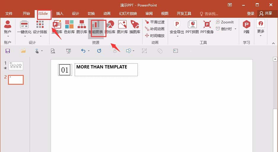 1、先在Excel做表格?——再到PPT切换代入?——再进行一系列的麻烦的操作?其实这些都不用,只需要先安装一个PPT插件,islide,然后选择智能图表。