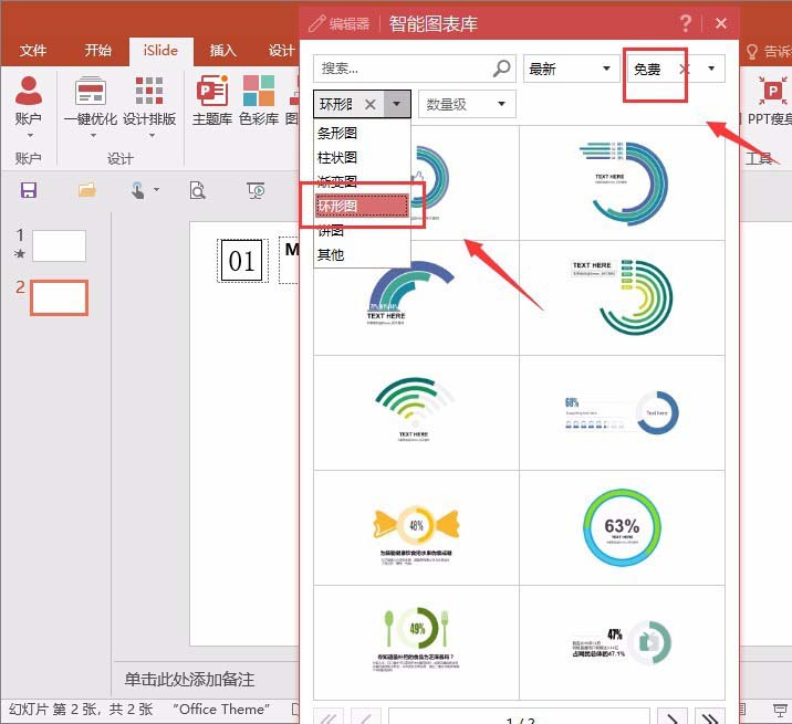2、这里的演示是环形图,所以我们只需要找到对应的环形图,还有就是选择免费的,当然高级一点权限的可能一个图表会更丰富一些。
