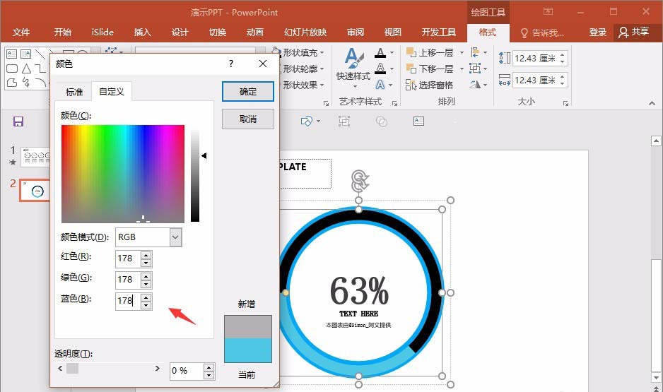 4、进行一个修改,比如我们可以修改填充颜色,当然13版本以上的PPT可以使用取色器,如果没有,那就手动输入黑色的RGB为:0,0,0;而灰色的RGB为:178,178,178。