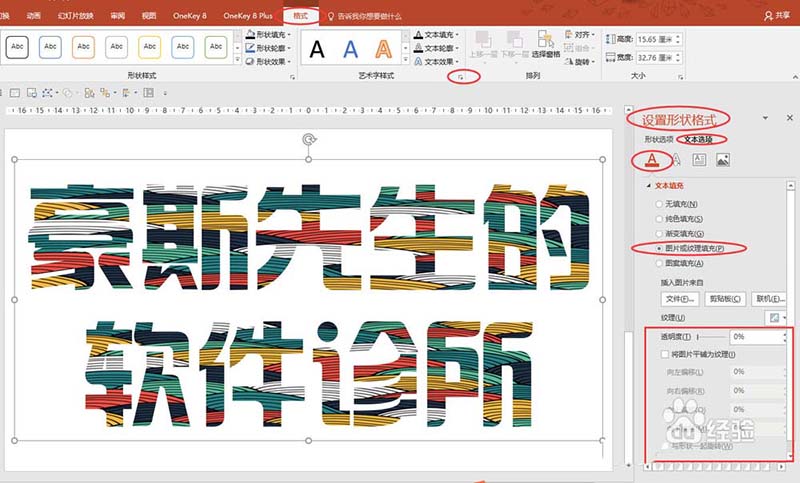 4、这时,虽然图片已经填充到文字中,但我们还需对它进行进一步的微调,点击,“艺术字样式”右下角的小方块标志,在屏幕右侧出现的“设置形状格式”菜单中,可以继续对“透明度”、“纹理偏移量”就行设置。