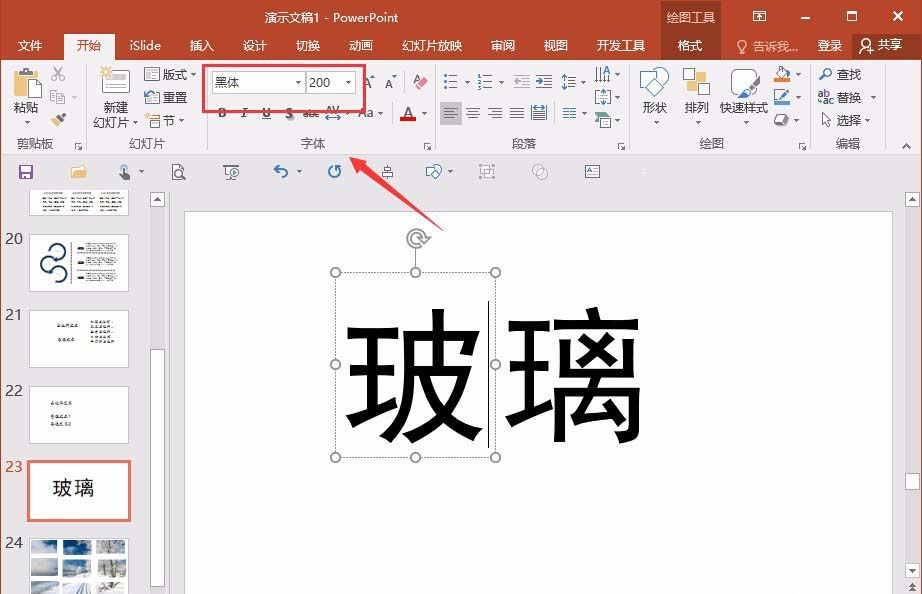 1、比如,破碎一般比较容易想到玻璃,那么我们就以“玻璃易碎”这几个字来举例,先插入一个字体,大小自己掌握即可(这里,黑体,大小200,填充黑色)。