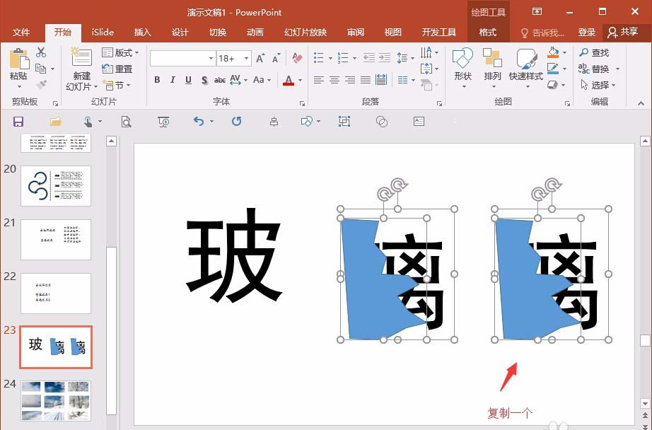 2、先从“璃”开始,熟悉了一个的操作,其他的就比较简单了。选择插入形状——插入任意多边形——在文本字上进行覆盖(如图的效果)。