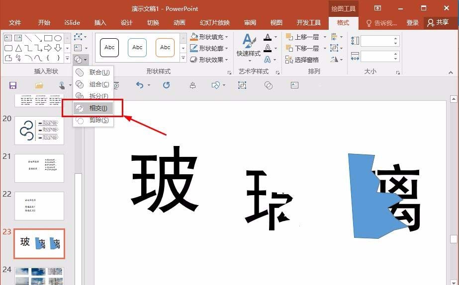 4、对一个,选择绘图工具——格式——相交,另一个,选择剪除(备注:至于什么时候用相交,什么时候剪除,关键看选择形状的顺序,顺序不同用到的也不同)。