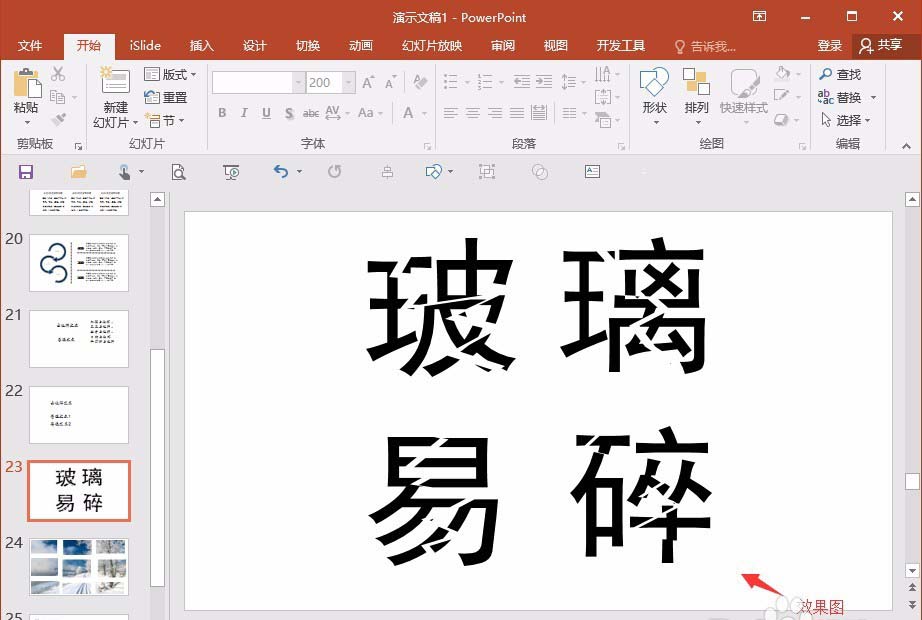 6、用上面的操作,对“玻璃易碎”其他三个文本,也进行一个操作,便可以得到下面的效果图了,这样是不是感觉字体有破碎的感觉了。
