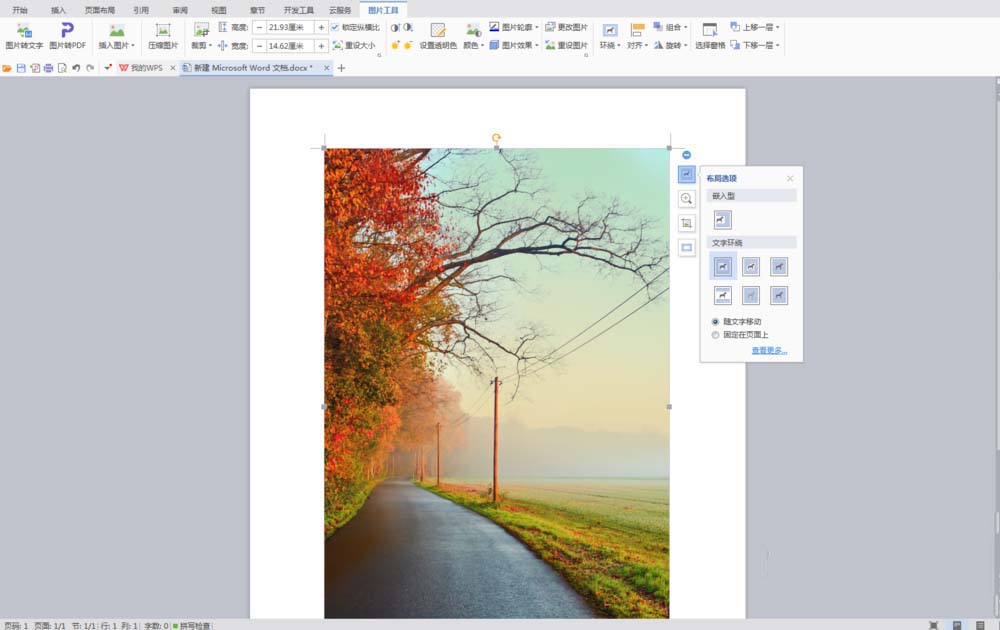 3、单击图片,“布局选项”——“四周环绕型”,把图片拉开,填充满整个背景。