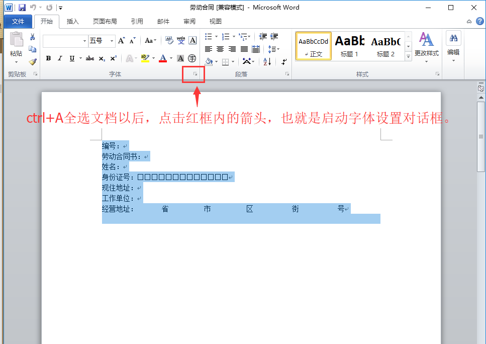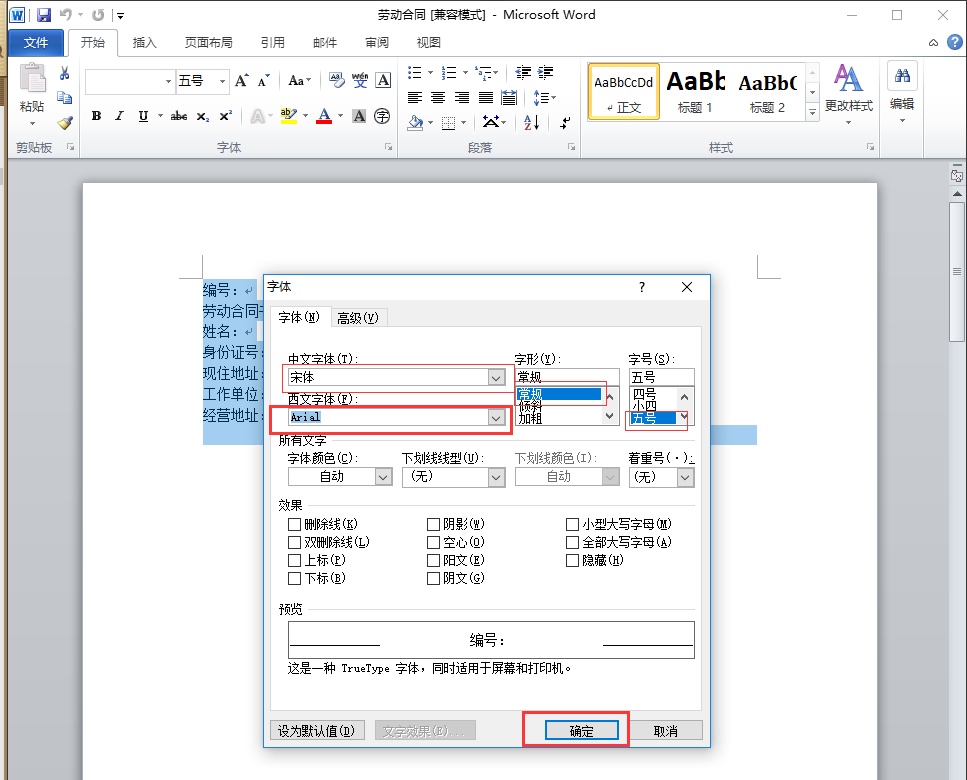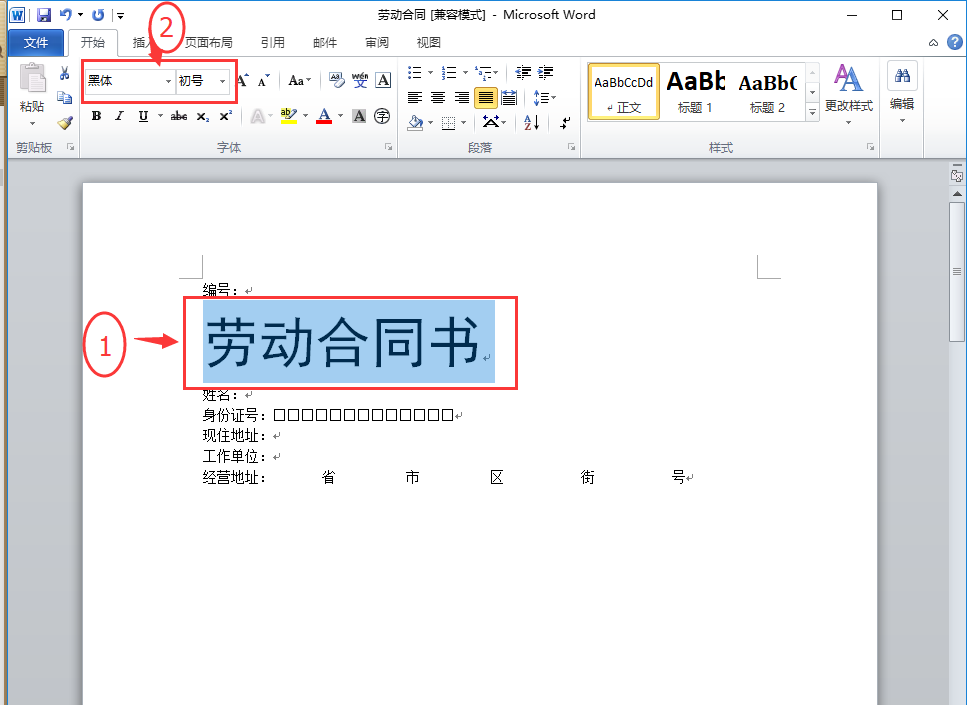 ①选中标题劳动合同书,在开始选项卡中字体选择黑体,字号初号,如图所示。