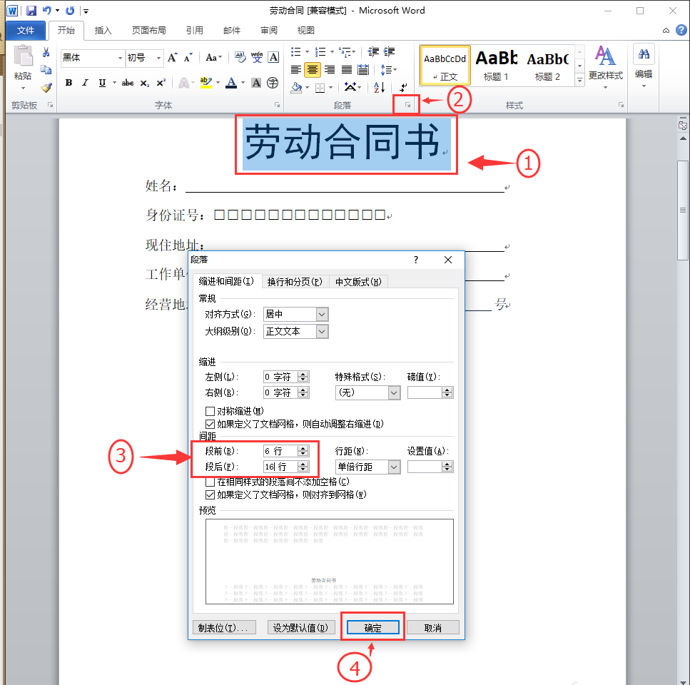 ③单击段落组右下角的箭头,打开段落对话框,设置段前间距为6行,段后距离为16行。点击确定完成设置。如图