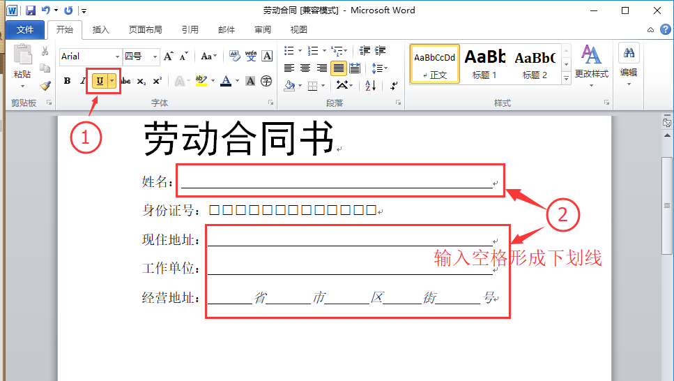 光标定位在“姓名”后,点击开始选项卡中的下划线按钮,输入多个空格就能显示出下划线,如图所示。按照这个操作,给所有需要添加下划线的位置进行添加。