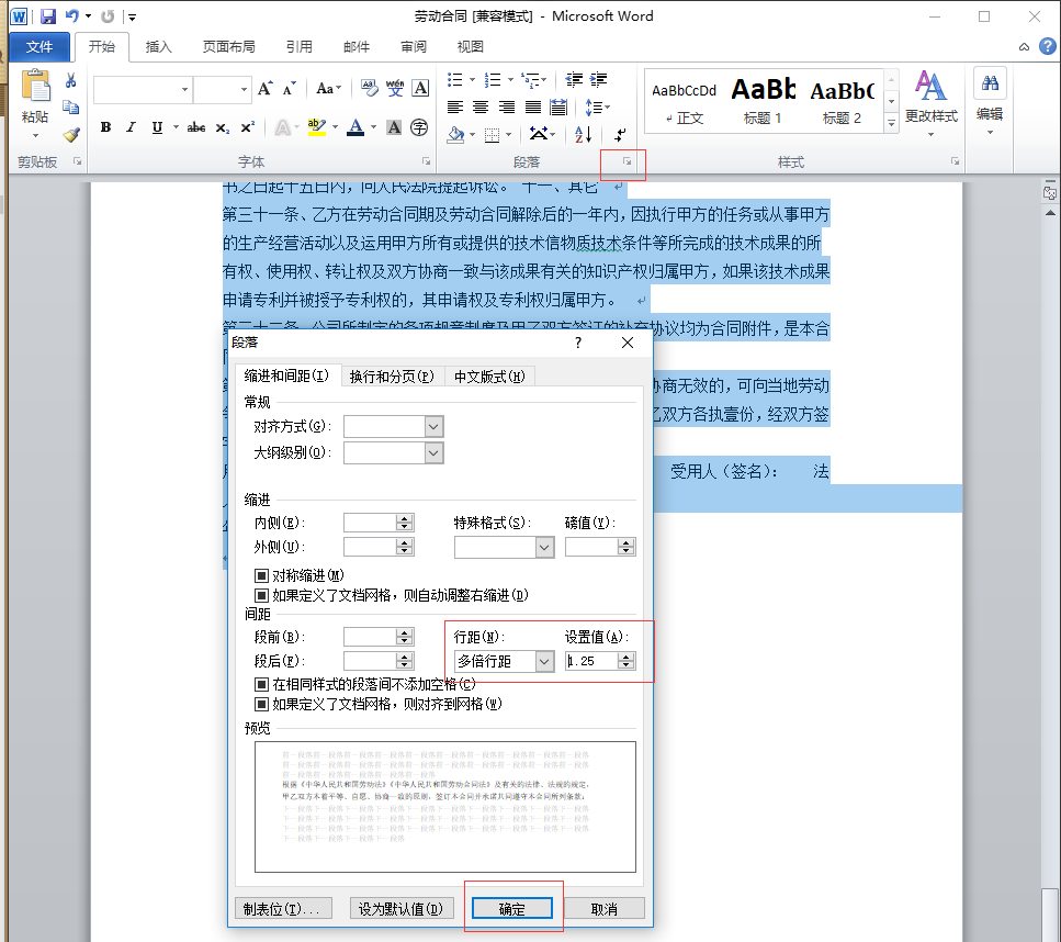 选择除首页外的正文内容,打开段落对话框,设置行距为多倍行距,设置值为1.25,单击确定。