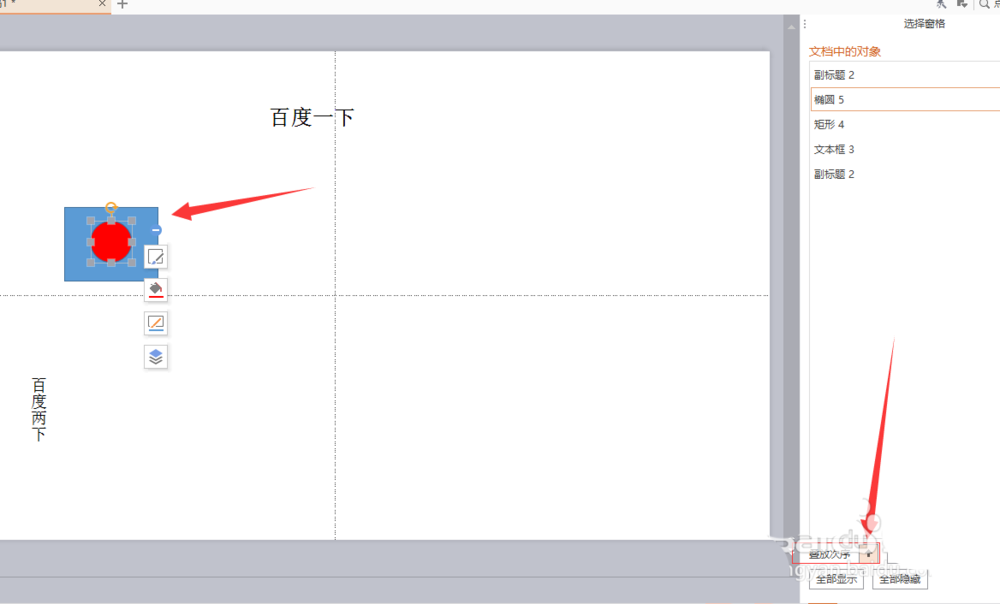 5、点击下方的叠放次序,可以调整元素之间的图层顺序。还可以点击元素后方的眼睛来隐藏或者显示元素。