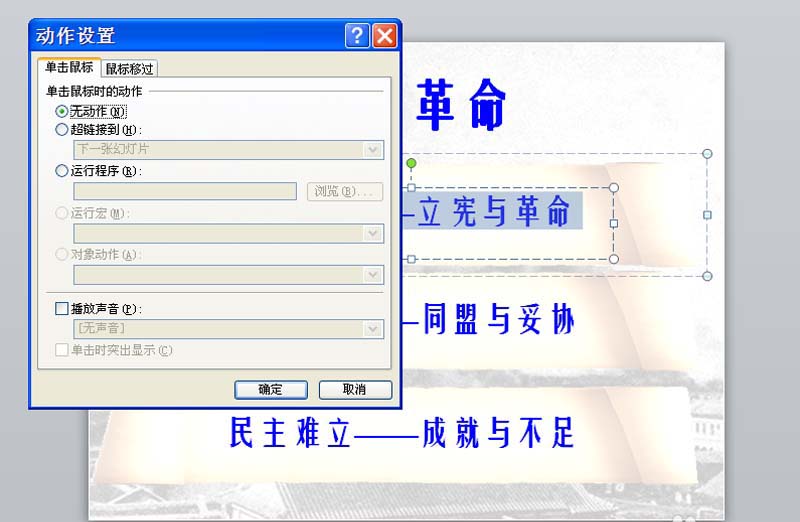 3、在弹出的动作设置对话框中切换到单击鼠标选项,勾选超链接到,在弹出的超链接到幻灯片对话框中选择需要连接到的幻灯片,点击确定按钮。