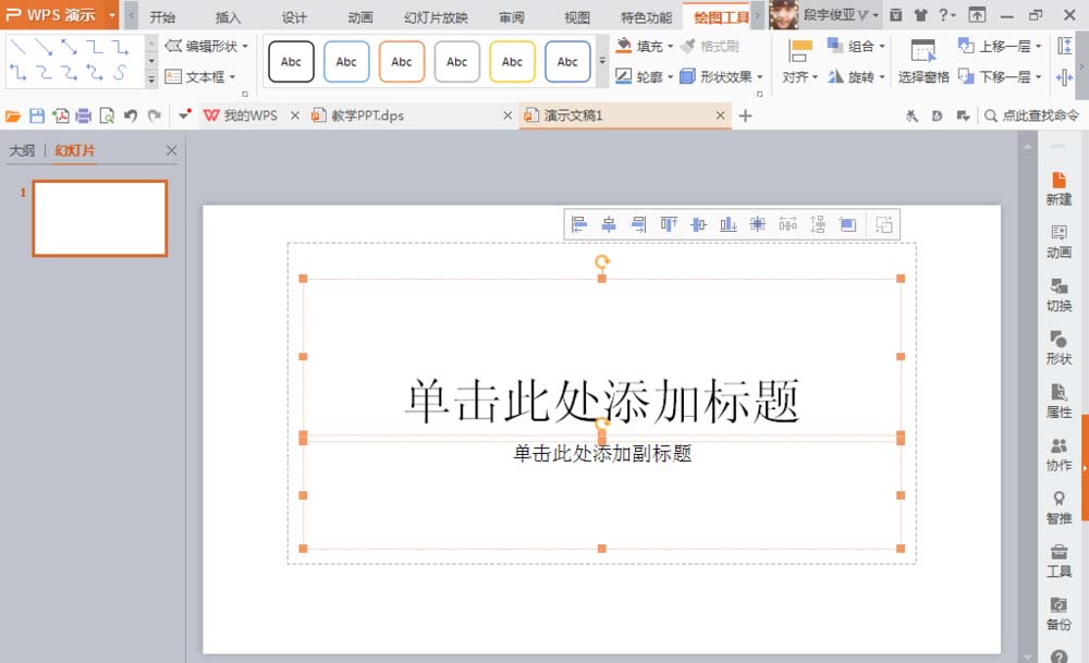 1、打开WPS演示文稿,新建一个宽屏16:9的空白文档,框选文本框文字内容,包含有主标题,副标题,点击delete键,删除多余内容。