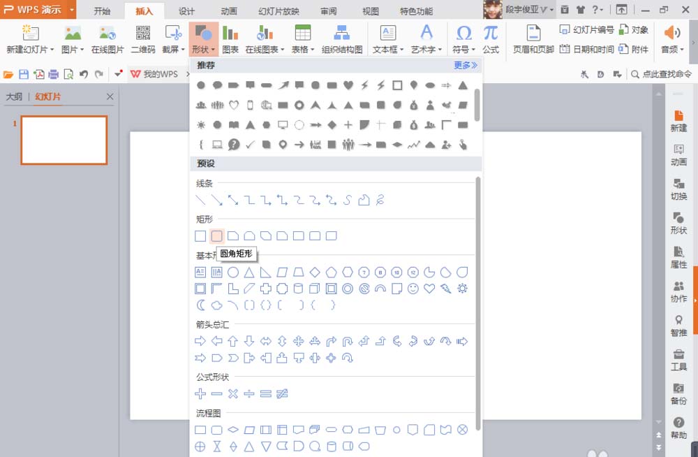 3、选择插入,形状,在矩形选项中,找到圆角矩形工具,如图