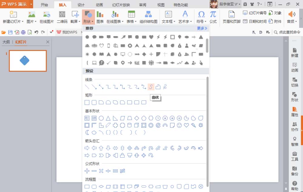 6、继续选择插入,形状,选中预设选项,选择S形状,S形状可以自动绘制一个类似卷毛形状图形。如图