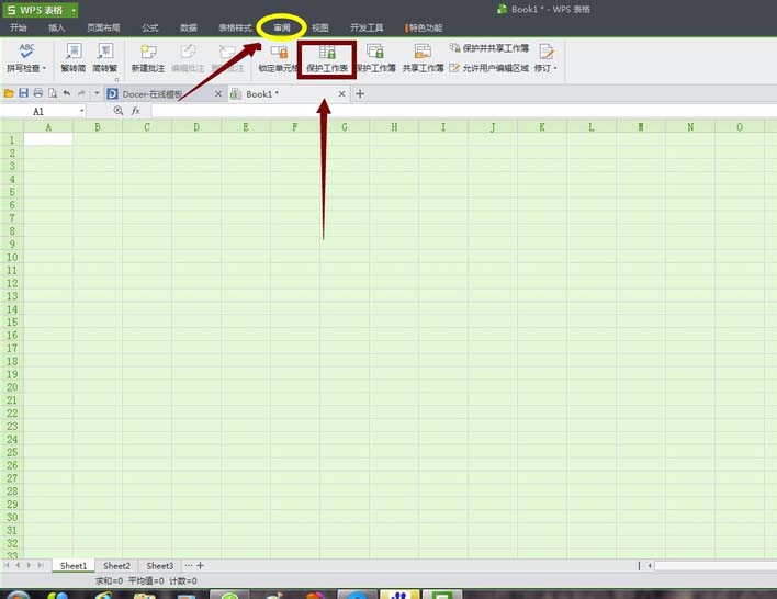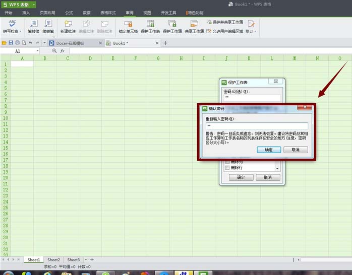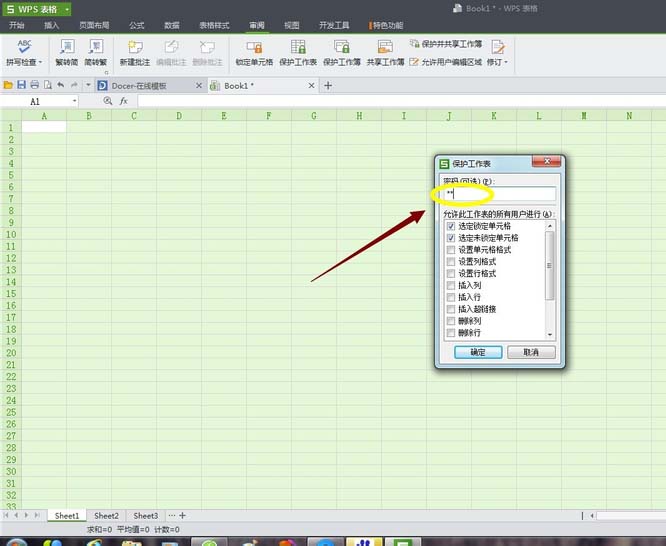 3、接着继续选中单元格,然后点击表格工具栏的"审阅",我们可以看到在右下有“保护工作表”选项。点击它会弹出要求对单元格加密的对话框,输入密码就完成了对整个单元格的锁定(务必记住密码,因为丢失密码将无法恢复)
