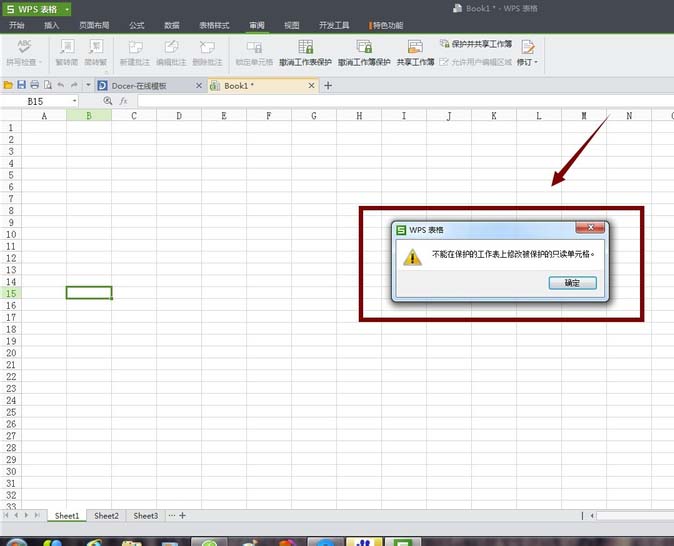 4、此时,就完成了对整个Sheet1表格的锁定,这时我们是无法编辑的,一旦输入任何内容都会有提醒“不能再保护的工作表上修改被保护的只读单元格”,如图。