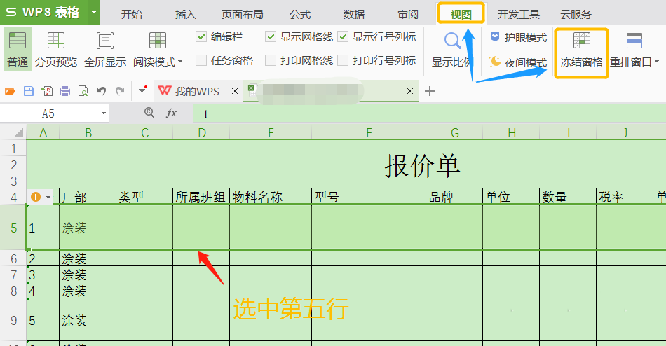 3、正常情况下,我们往下滑动鼠标或者向右移动滚动条,刚才的A列和第4行就看不到了,如果要锁定它们,那么就要选中它的下一行/下一列,然后切换至"视图"-"冻结窗格"即可,锁定列也是这个方法;