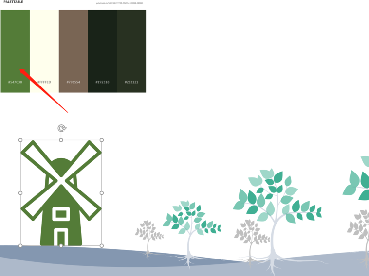 2、将你的配色方案插入该页PPT。我在配色网站(palettable)找到一组配色,这个网站可以直接将配色方案导出为图片。你也可以将自己喜欢的配色截图或者以其他形式保存。