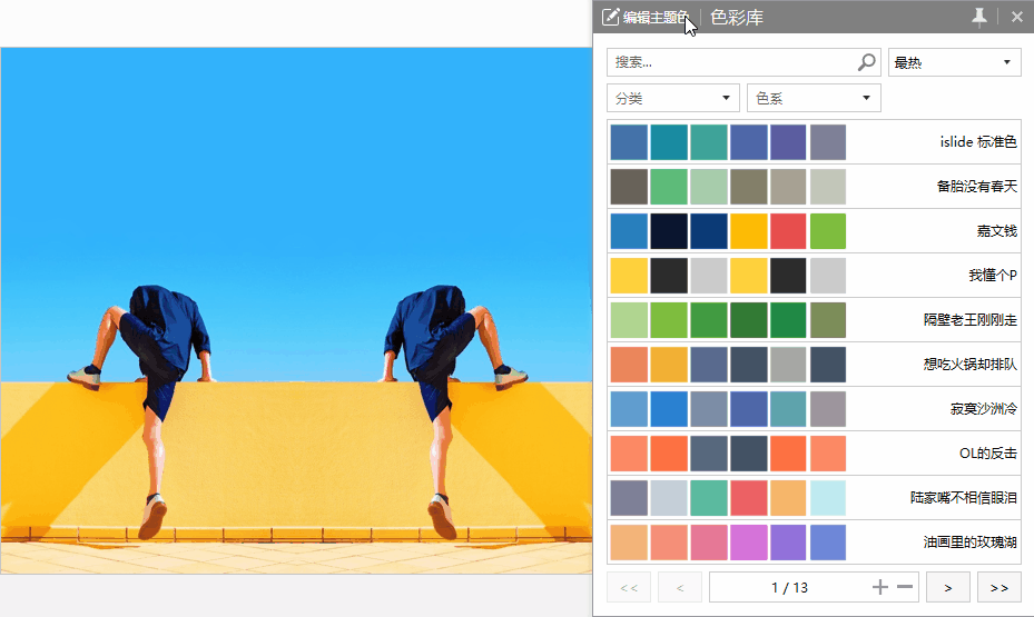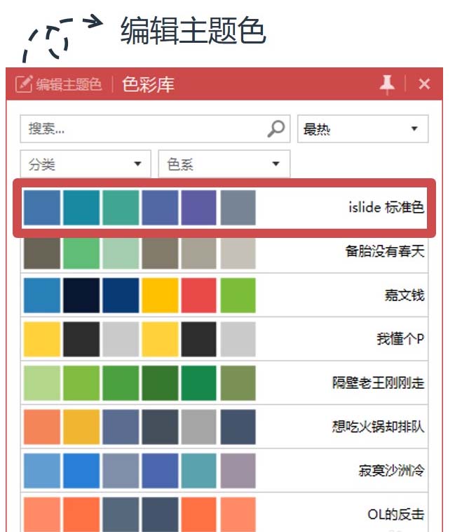 法二、打开色彩库,选择【编辑主题色】,单击配色方案中的任意一种颜色,即可调出取色器。