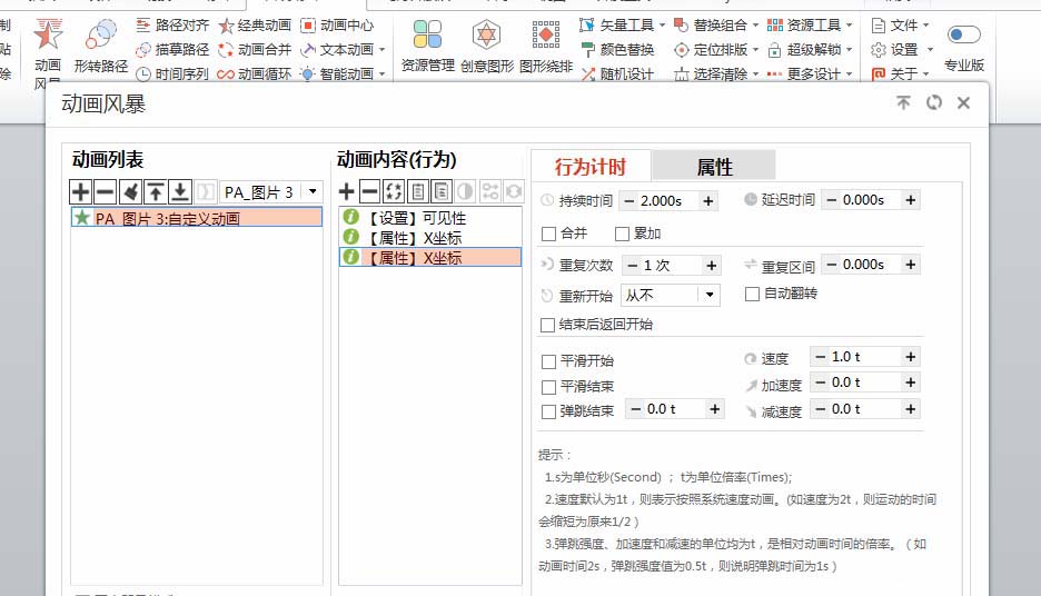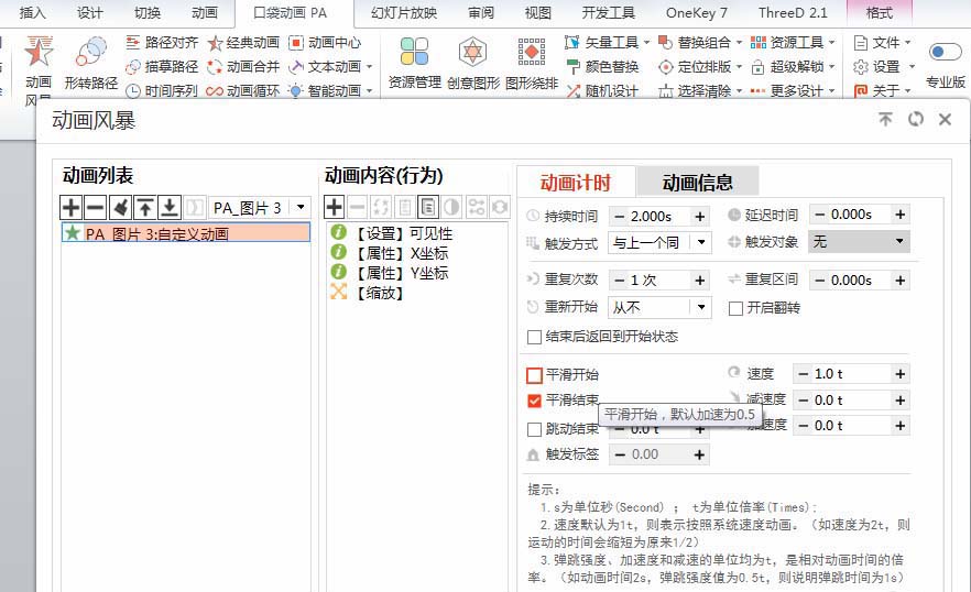 7、切换到动画计时选项卡,设置持续时间为2秒,触发方式为与上一动画同时,并勾选平滑结束,关闭动画风暴。