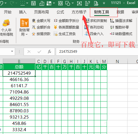 2、点击下图【财务工具】(Excel工具箱,具体的下载安装方法百度即可,本文这里不做详细解说)